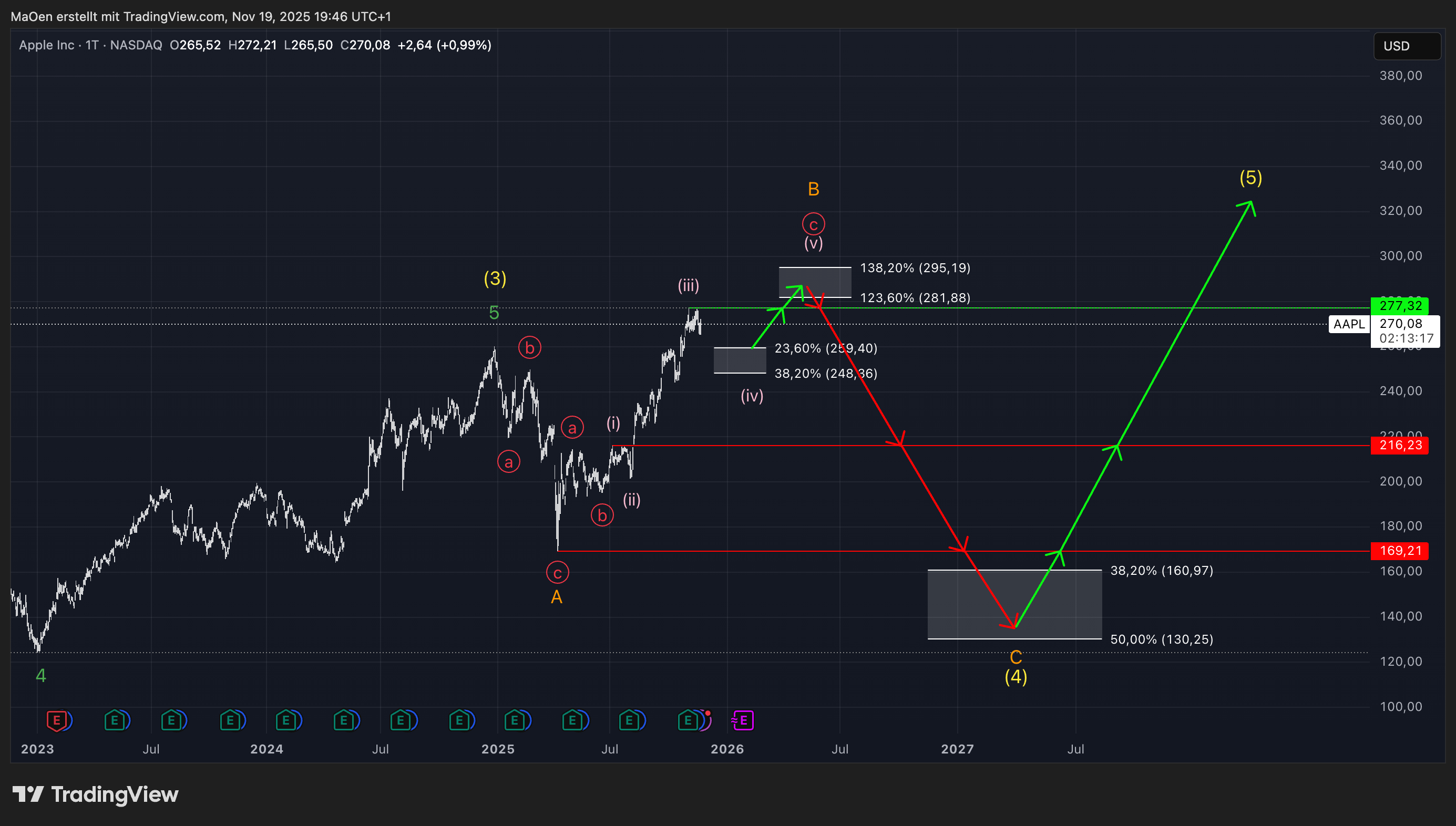 In our short-term scenario, we expect Apple to form an overshooting Wave B (in orange). For this anticipated Wave B extension, we have defined a shorting zone between the 123.6% Fibonacci extension at 281.88 USD and the 138.2% extension at 295.19 USD. Within this zone, we expect the overshooting orange Wave B to terminate, marking a transition from bullish momentum into a bearish reversal.