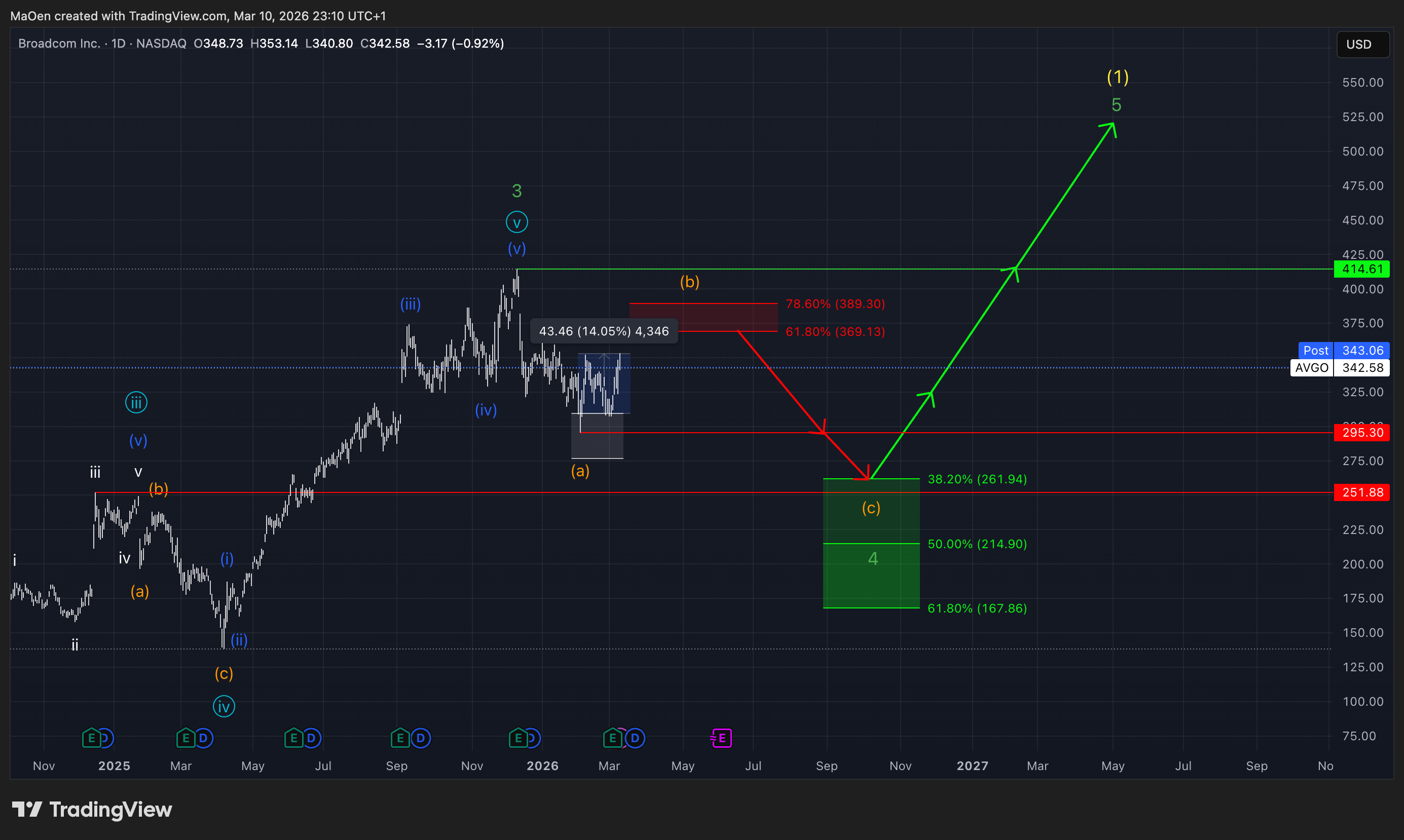 In this area, we expect orange wave b to terminate, lose its short-term bullish momentum, and re-enter the long-term corrective phase that we initially anticipated on 02.02.2026 (https://monalytics.org/broadcom-avgo-update/).