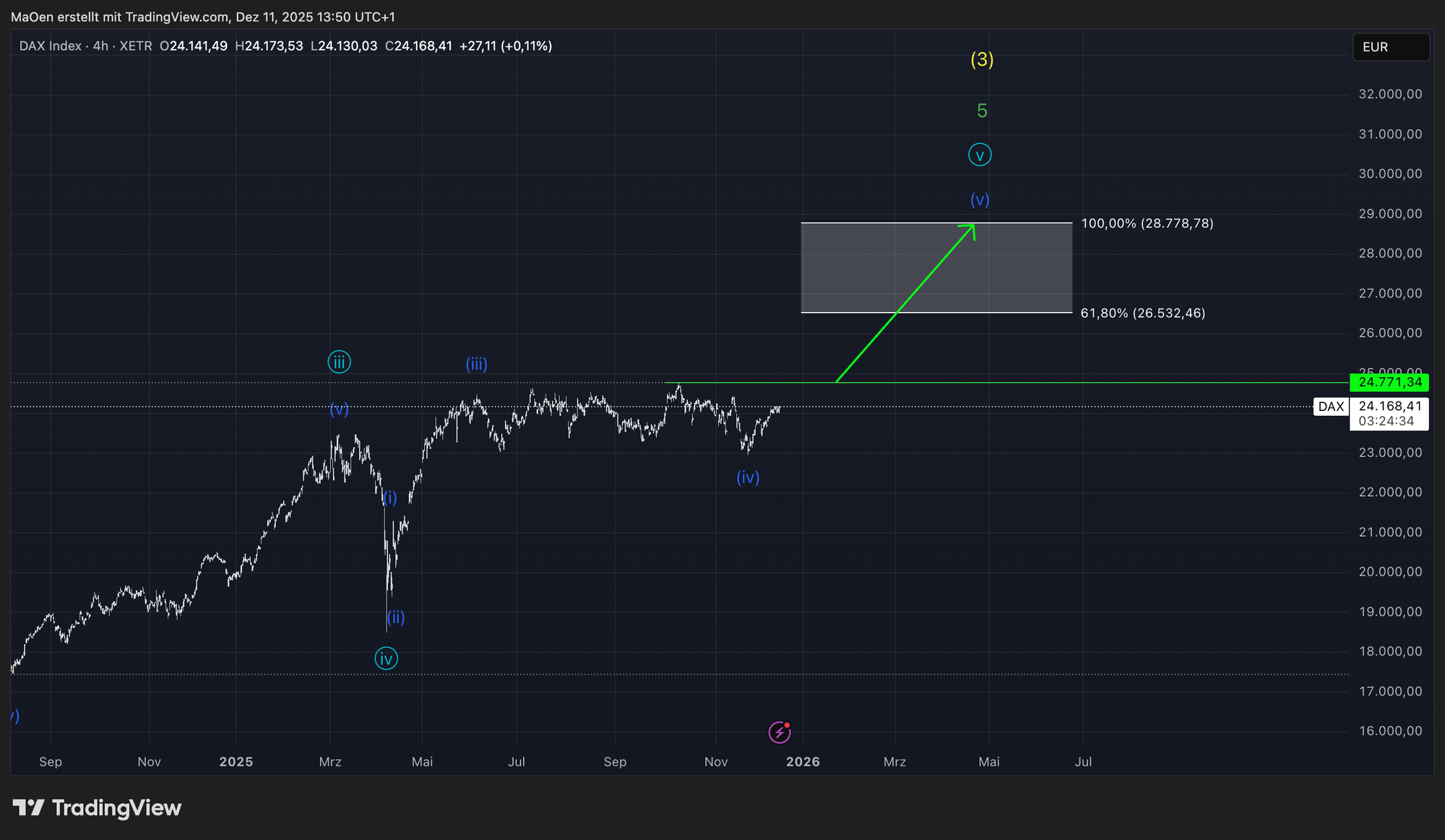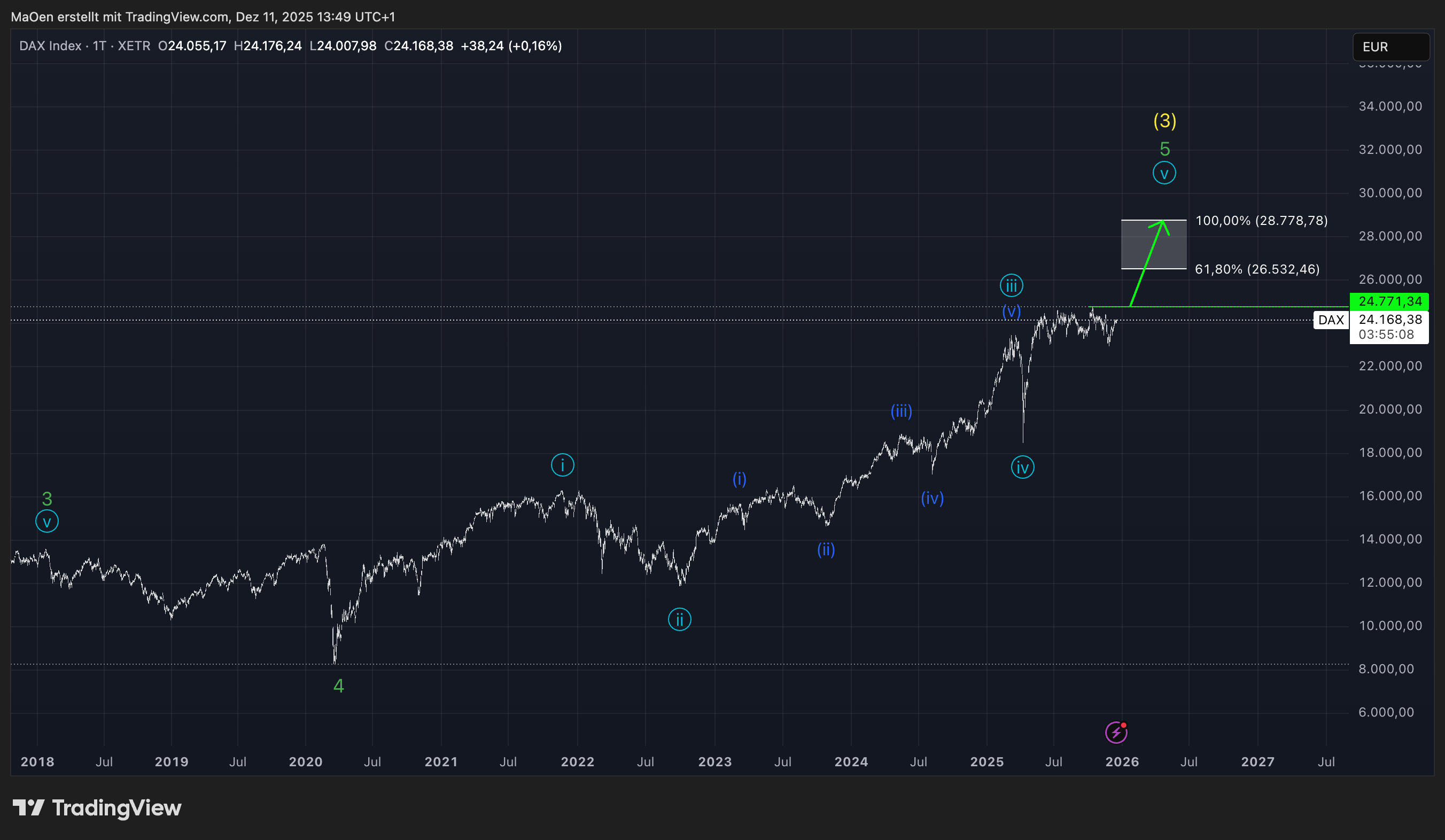 At present, the DAX is developing light blue wave 5, which represents the final stage of the light blue-degree cycle. The completion of this wave will finalize green wave 5, which in turn marks the termination of the long-term yellow wave 3.
