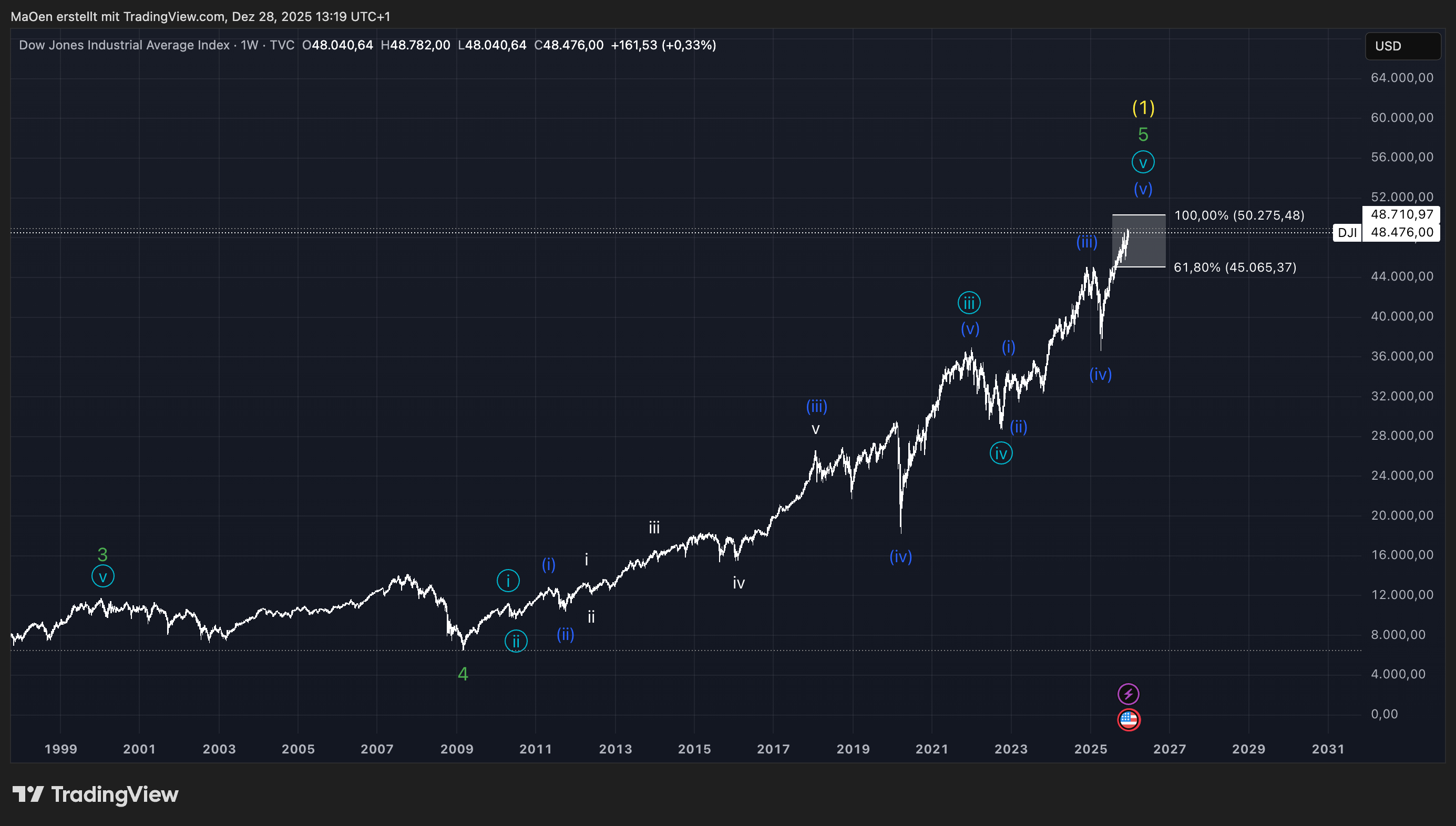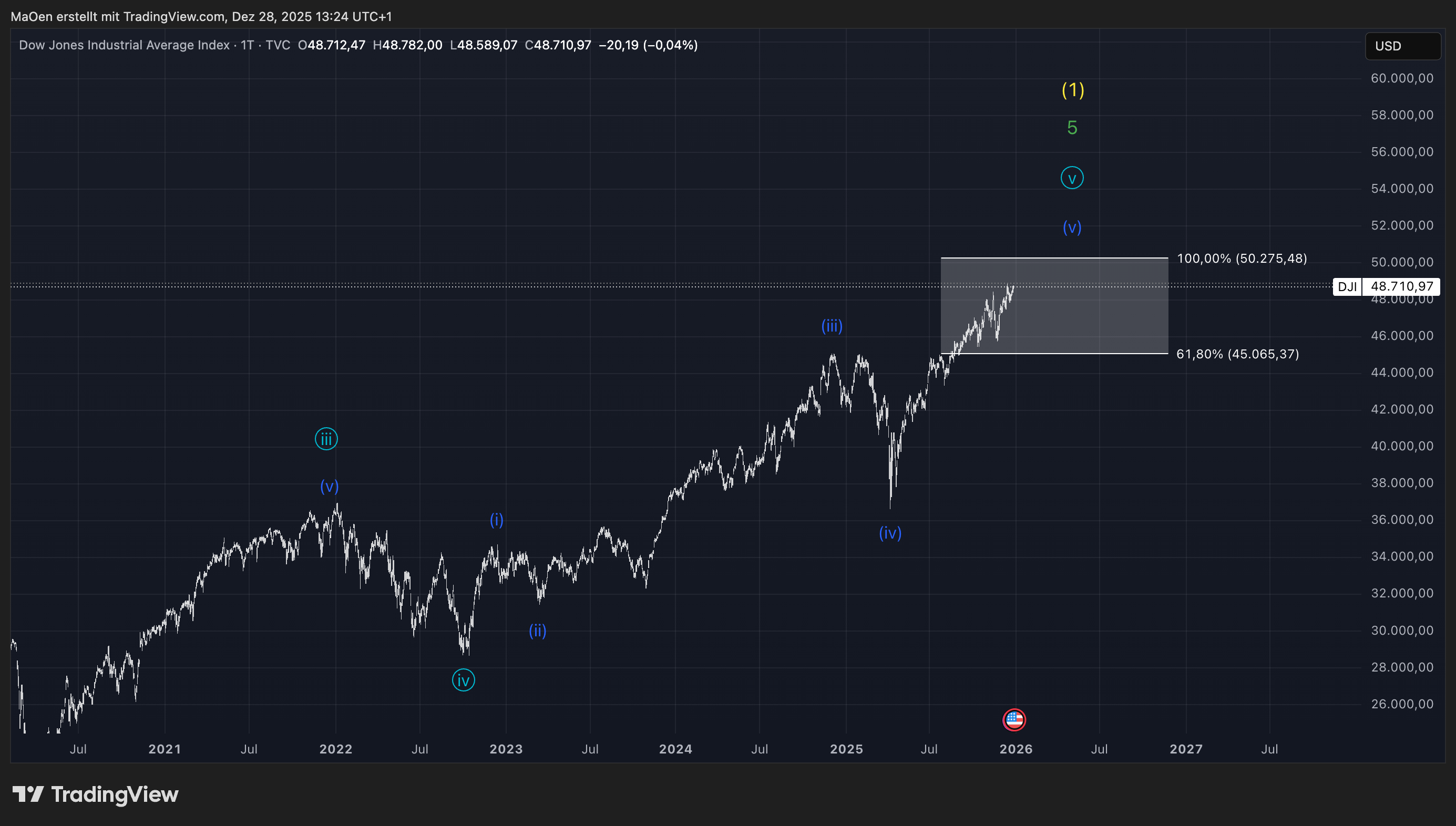 This Fibonacci price target zone starts at the 61.8% level at 45,065.37 points and extends up to the 100% level at 50,275.48 points. The Dow Jones is currently trading at 48,710.97 points and has already entered our projected price target zone. At this stage, the index is continuing to move higher toward the 100% Fibonacci level.