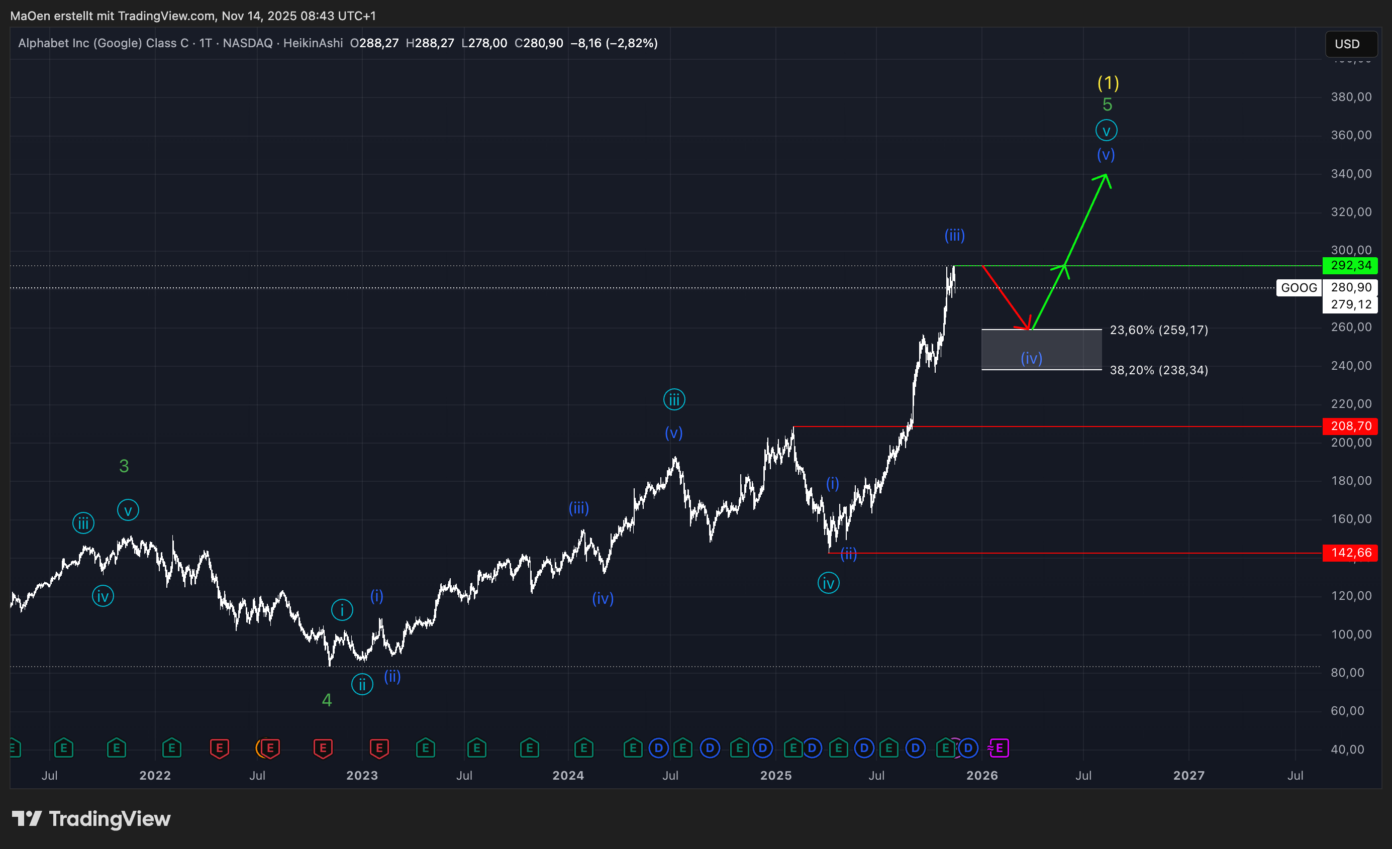 If this trend reversal is validated, we will publish our usual Fibonacci retracement zones, highlighting the areas where we expect Google to regain bullish momentum and complete its corrective yellow wave 2. From there, the stock would be positioned to start a new major impulse into yellow wave 3 — typically the strongest and most dynamic wave in Elliott Wave theory.