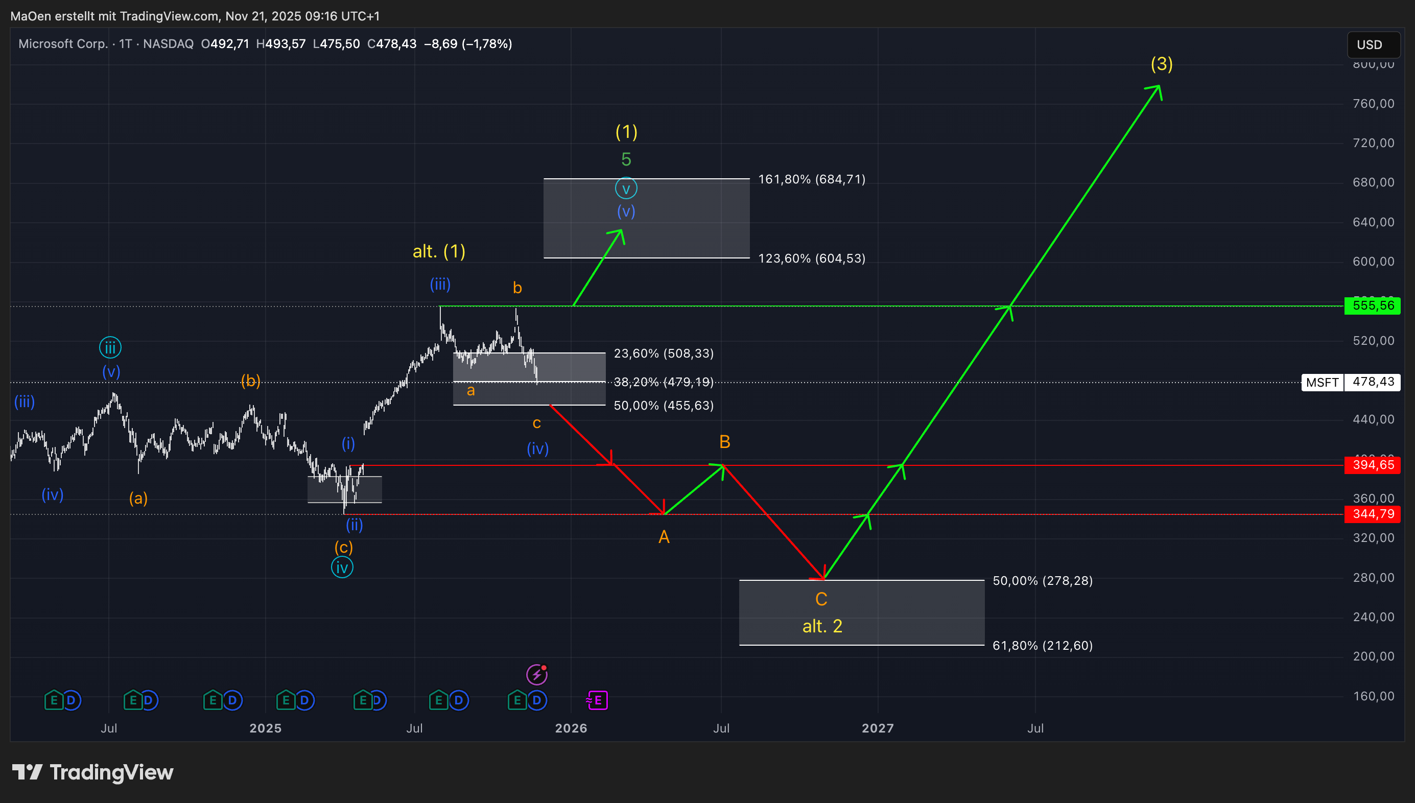 For this alternative scenario to be confirmed, Microsoft must decisively break below the red-marked support levels at 394.65 USD and 344.79 USD.