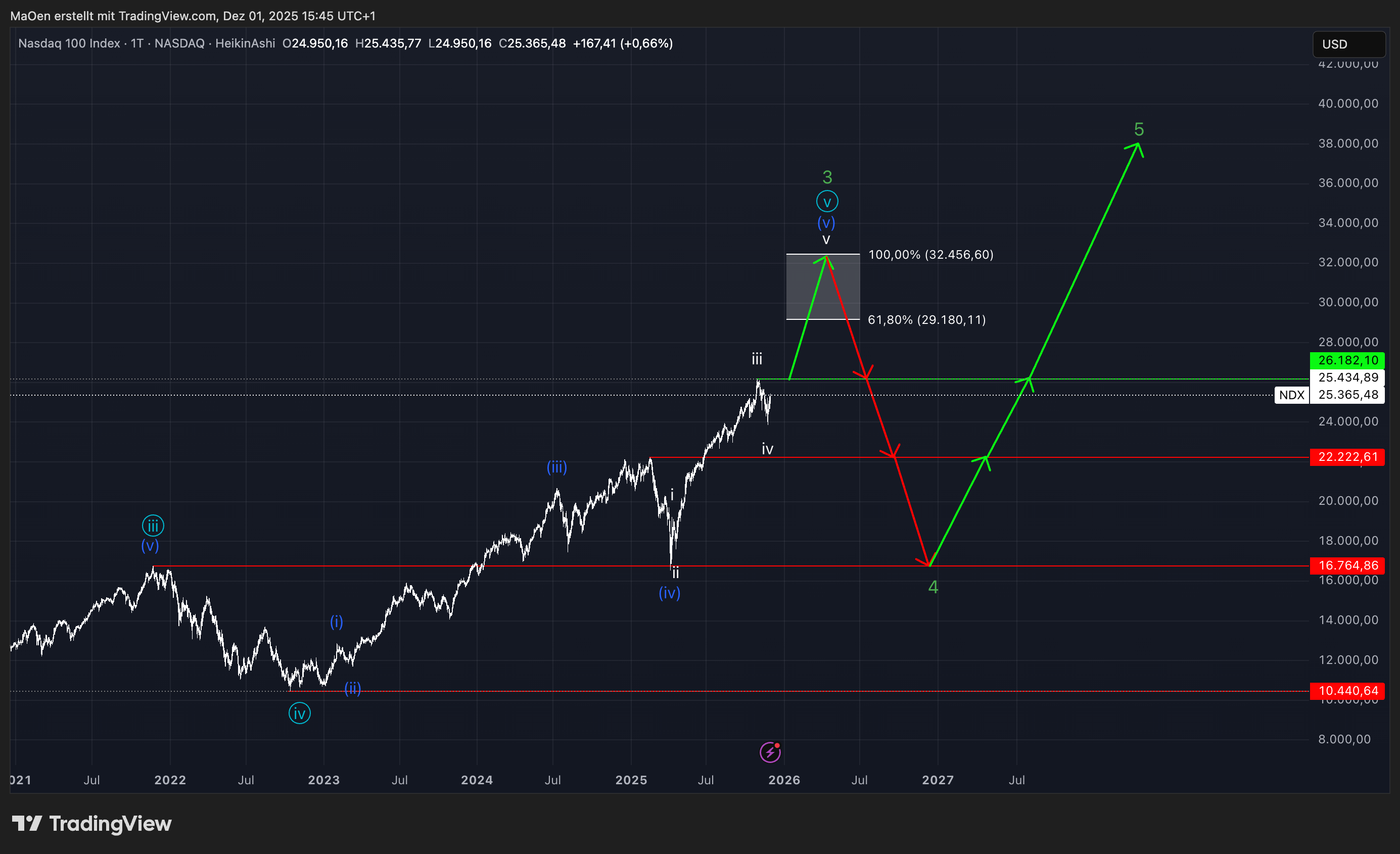 We have defined a projected price zone ranging from the 61.8% extension at 29,180.11 points up to the 100% extension at 32,456.60 points. This zone represents the region in which we expect the Nasdaq to top out and establish its final all-time high for long-term green wave 3. At the same time, this area serves as a shorting and profit-taking zoneahead of the upcoming corrective phase.